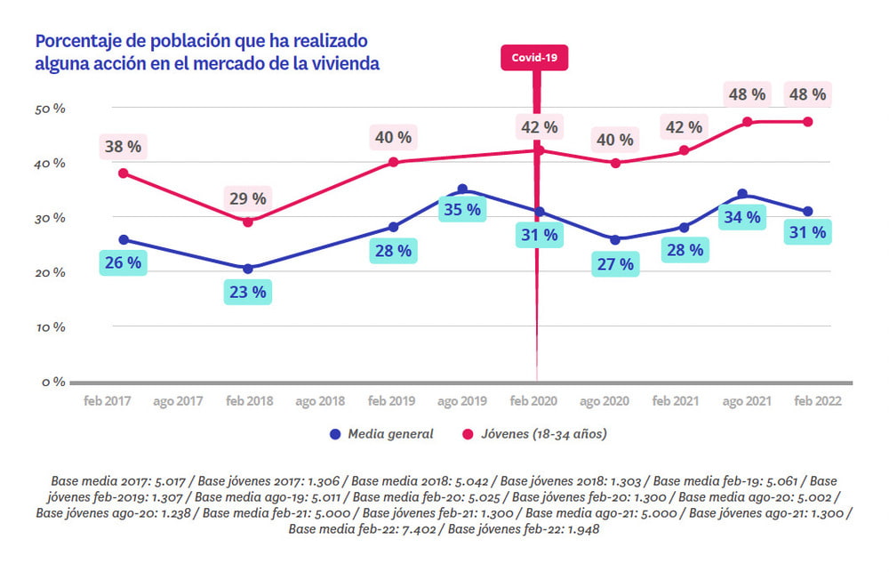 - Un 48% de los jóvenes (18-34 años) ha realizado alguna acción en el mercado de la vivienda en los últimos doce meses mientras que en 2021 fue el 42%